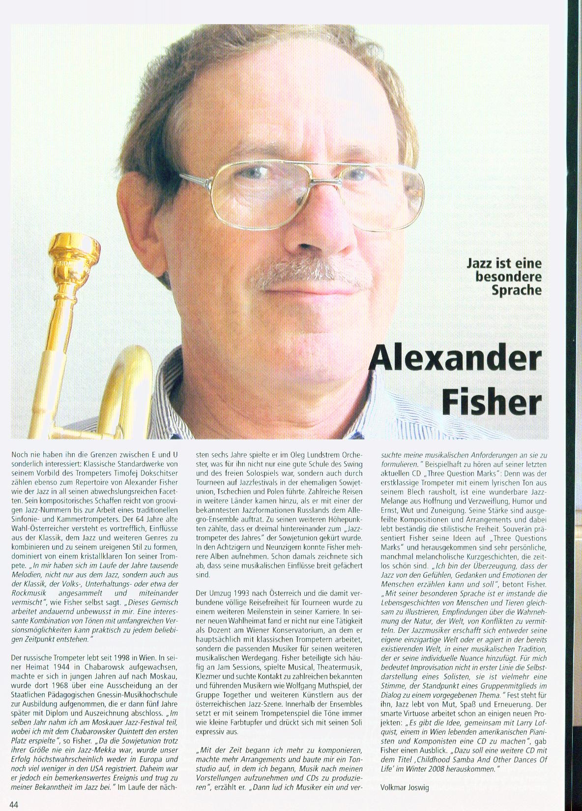 Der Trompeter Alexander Fisher wurde in Chabarovsk (Russland) geboren, wo er auch seine ersten musikalischen Schritte machte. Er nahm Klavierunterricht und sammelte seine ersten Orchestererfahrungen: in Blasorchestern, Orchestern für Unterhaltungsmusik, Dixielandensemble... Noch in Chabarowsk spielte er dann mit vier anderen Musikern im "Wadim Gorowiz - Ensemble", das auf dem "Moskauer Jazz-Festival 68"