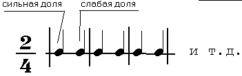 То же самое можно изобразить графически, где временные отрезки равны длительностям четвертных нот сильных и слабых долей: