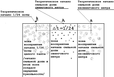 2) Если же отношение величин времени сильных долей к слабым равно 2:1 (то есть при delta t, равной величине длительности 1/24 ноты четырехчетвертного такта), возникает явное ощущение триольности. Поэтому начало сильной доли в свинговом метре должно быть вне пределов зоны восприятия начала сильной доли несвингового метра и, в то же время, вне пределов зоны восприятия триольности. Это и произойдет в том случае, если величина delta t (согласно математической науке- достаточные условия) будет меньше или равна следующей разности: величина длительности 1/24 ноты четырехчетвертного такта несвингового метра минус сумма половин временных величин зон восприятия сильной доли несвингового метра и 1/24 ноты (триольность). Эта разница будет примерно соответствовать величине несколько меньшей, чем длительность 1/32 ноты четырехчетвертного такта несвингового метра.