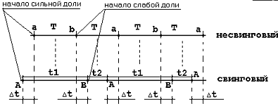 Для исторически определенного стилевого периода джаза будем считать справедливым, что игра со свингом - это своеобразное исполнение музыки в "свинговых" метрах. Такие метры характеризуются периодическим чередованием отрезков времени t1 и t2, соответствующих сильной и слабой долям такта; при этом, длительность t1 больше t2. Половина же их разницы, delta t - есть величина, на которую раньше начинается отсчет времени сильной доли и на которую он заканчивается позже слабой (относительно начал долей, чередующихся через равные промежутки времени "несвингового", метрономного, метра).