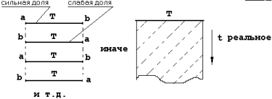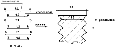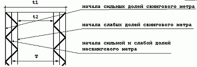 где: начала отрезков t1 - начала сильных долей, а начала отрезков t2 - начала слабых долей.