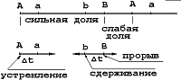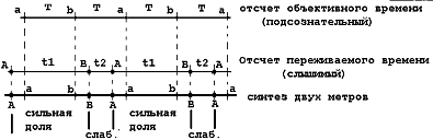Резонно заметить: почему не наоборот? Может быть, момент начала сильной доли объективного времени "тянет назад" момент начала сильной доли времени "реального", и аналогичное происходит и со слабыми долями? Однако этого не происходит, так как сознание слушателя начинает вести отсчет с "сильного" времени, ибо, согласно экспериментальным исследованиям О.М.Агаркова, одним из признаков сильной доли является ее согласование с более протяженной длительностью. (О.М.Агарков. "Об адекватности восприятия музыкального метра"). В нашем случае на сильной доле информация начинается раньше ожидаемого времени. Начало же слабой доли (точка b) сознание уже ждет; оно предвосхищает событие, которое наступает с некоторым опозданием.