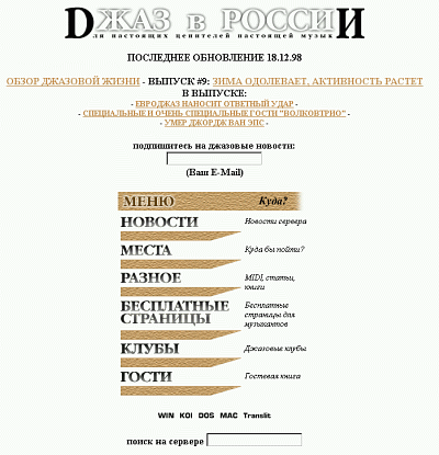 Правда, самый ранний из сохранившихся у нас в архиве скриншотов показывает его таким, каким он был не пять, а четыре года назад, в декабре 1998-го, но все равно это довольно странное зрелище - особенно для тех, кто присоединился к нам позднее (если кликнуть по картинке, то можно, для смакования отдельных деталей, увидеть ее более крупную версию). Тем не менее, каким бы портал (впрочем, тогда еще скромно позиционировавший себя как "сервер") ни был, факт есть факт: основные элементы его нынешней структуры существовали уже на раннем этапе - еженедельный журнал (четырехлетие которого мы отметили две недели назад), справочно-информационная часть (персональные страницы музыкантов, расписания клубов и т.п.) и даже прообраз нынешних чата и форума в виде гостевой книги, архив которой (с первой записью за 9 декабря 1997 г.) доступен до сих пор.