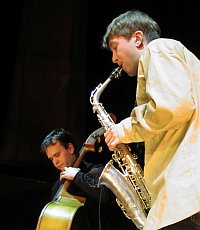 Первым вышел на сцену "Оранжевый мир" из Белгорода - коллектив молодой, явно еще не выбравший собственный путь в музыке и потому часто неровный, но сразу четко ответивший на "альтернативный" вопрос. Все участники этого секстета очень молоды, и в терминах функционеров от музыки место им нашлось бы самое большее на юношеском или даже подростковом конкурсе. Но они не стесняются показывать себя аудитории, существенная часть которой явно ожидала не столько экспериментов и новации, сколько чего-то доброго и старого. И они не стесняются играть при этом не столько джаз, сколько близкую им по возрасту музыку, в которой намешаны в яркий и острый салат и джаз, и арт-рок, и хард-рок, и этника.