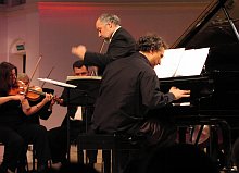 В первом отделений Ури Кейн при содействии Государственного академического камерного оркестра России под управлением Константина Орбеляна исполнил "Диабелли-Вариации" Бетховена. Нужно сказать, взаимодействие Кейна с оркестром было весьма условным и, похоже, односторонним. Возможно, сказалась пресловутая ограниченность во времени при подготовке программы, но оркестр выглядел довольно неповоротливо. Музыкальный материал был добросовестно сыгран, как написано в нотах, при этом привязанные к нотам оркестранты и импровизирующий солист до самого конца отделения так и остались по разные стороны баррикад, несмотря на настойчивые шаги к сближению со стороны Ури Кейна, не нашедшие должного отклика у оркестра. Многочисленные "передразнивания" и обыгрывания оркестровых партий звучали скорее как развернутые комментарии солиста, нежели как полноценный диалог, даже когда сама композиция произведения предполагала "вопросы" и "ответы". Ближе к концу первого отделения, видимо, все-таки, исходя из первоначального замысла, а не под воздействием ситуации, реплики Кейна стали более жесткими и диссонирующими, изобилующими "хулиганскими" цитатами, будучи умышленно противопоставлены оркестровому консонансу. Соло Ури Кейн исполнял преимущественно без сопровождения оркестра, и, что неудивительно, именно соло давали наиболее четкое представление о том, как именно Кейн представляет себе изложение темы. Это и адаптация ее к характерным для джаза ладам, и гармонизация, и смещение ритмических акцентов... Впрочем, свинг как таковой при этом угадывался в его исполнении едва-едва.