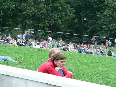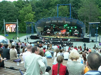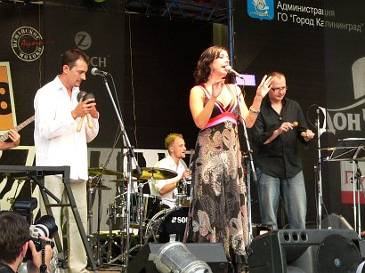 Мы, два редактора «Джаз.Ру», присутствовали на двух (из трёх) днях фестиваля. В программе «Дон Ченто Джаз» были, так сказать, «побочные сцены»: в дневное время в пятницу и субботу по городу курсировал «джазовый трамвай», а на малой открытой сцене в Фонтанном сквере играли местные, калининградские музыканты (на основной сцене из калининградцев появился только коллектив «Афроди» баритон-саксофониста Сергея Хлебалина, играющий «афробит»). Мы же главным образом видели выступления на основной сцене — так называемом «Певческом поле», открытом амфитеатре в Центральном парке города. Помимо сидячих мест амфитеатра и партера, зрители могли сидеть по бокам от амфитеатра прямо на траве, и многие воспользовались этой возможностью — правда, за ограждениями (как шутили на платных местах — «за чертой бедности»), метрах в тридцати от амфитеатра, «дикой» публики было в разы больше, чем на траве внутри (и её от ограждений никто не гонял). Впрочем, и амфитеатр заполнялся более чем удовлетворительно, к финалу фестиваля забившись под завязку.