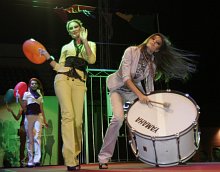 моделей девушки «играли» на стилизованных музыкальных инструментах,