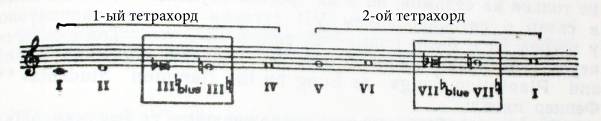 первой октавы до «До» второй октавы на два блюзовых тетрахорда: «до-фа»