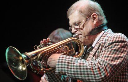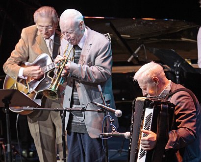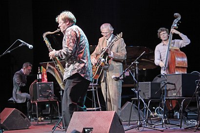 С тем же драйвом, живостью, усердием и бесконечной энергией выступил новый коллектив: на сцену к Алексею Кузнецову вышли Владимир Данилин (с аккордеоном — этот дуэт мы давно и хорошо знаем), Дмитрий Власенко (барабаны) и Андрей Товмасян (труба). Данилин и Кузнецов ловко чередовали соло-партии, в то время как живая легенда советского джаза Товмасян, флегматично расхаживая по сцене, с упоением увлекался импровизацией.