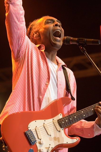 Gilberto Gil (Brazil) Жильберту Жиль — певец, гитарист, автор песен, да ещё и министр культуры Бразилии, полное имя которого Gilberto Passos Gil Moreira (Жильберту Пассуш Жиль Морейра). Несмотря на начавшийся дождь, публика принимала его горячо, и никто не торопился уйти. Состав: Gilberto Gil (гитара, вокал), Alex Fonseca (барабаны), Arthur Maia (бас), Bem Gil (гитара), Sergio Chiavazzolli (гитара). |